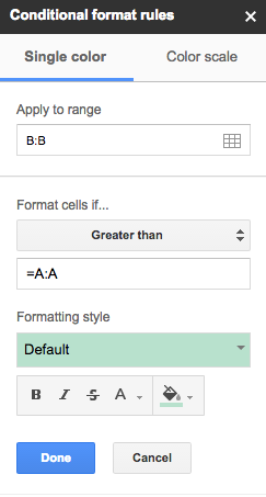 In laymen’s terms, this tells the script to pull the value of the previous cell. I’m sure there are much more elegant solutions, but this works for what I need. This script also assumes that you will be editing each cell manually by hand, ie: data entry. In the new version of Google Spreadsheets, this script wouldn’t be necessary. You can now do conditional formatting with formulas, so you could create a statement like the photo attached.